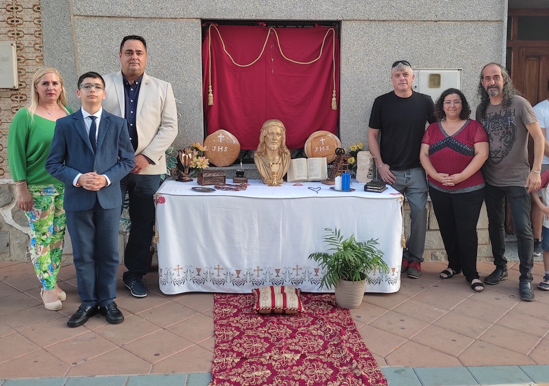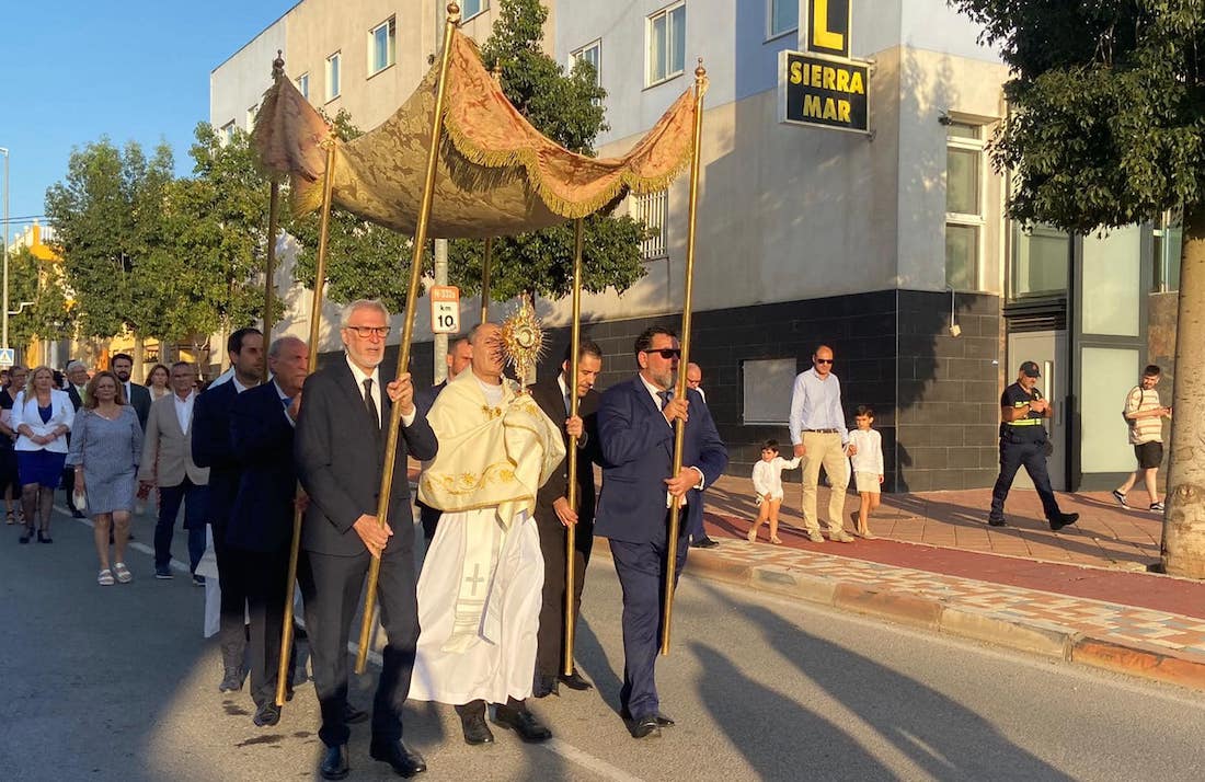 El Sagrado Corazón fue portado bajo palio por Ginés Luis Vicente, titular de la iglesia de la patrona, abriendo una procesión que continuaban los niños que han comulgado por primera vez este año y un buen número de feligreses, entre los que figuraban el alcalde en funciones, Pedro López, y varios ediles actuales y próximos del consistorio, además de representantes de la Cofradía del Cristo de los Mineros, entre otros.