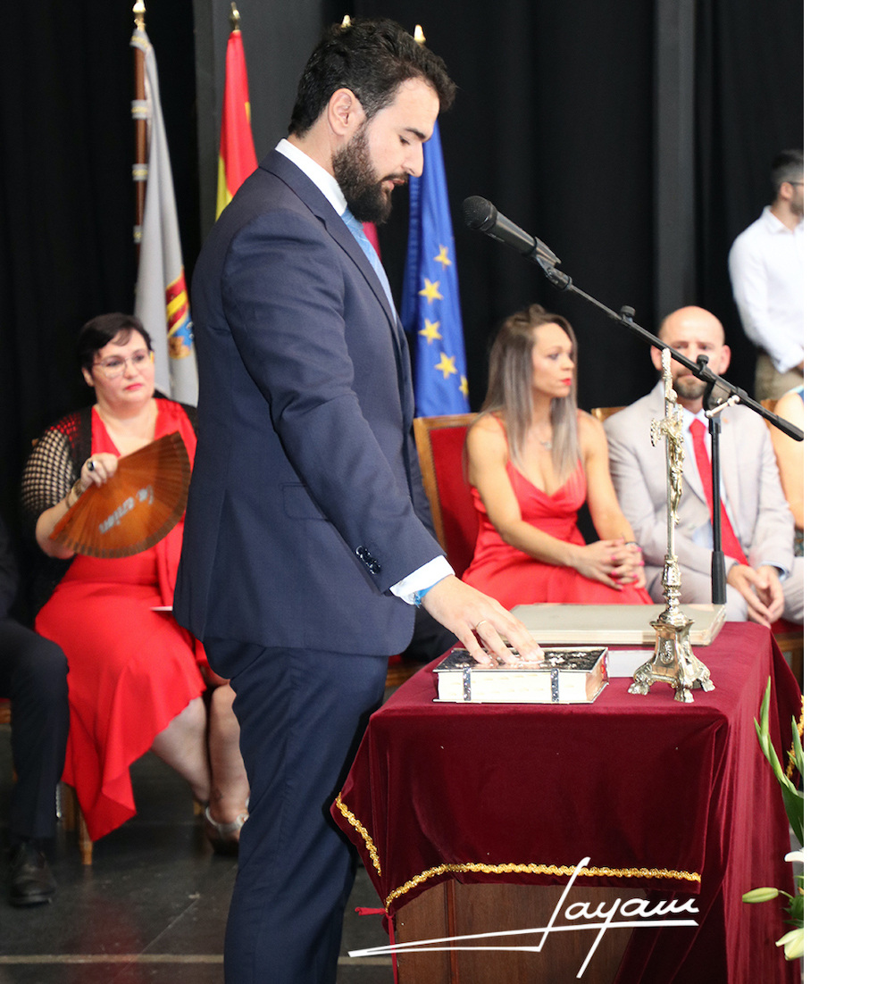 El nuevo alcalde ha comenzado su alocución dando las gracias "con mayúsculas a los 3.287 votantes que han llevado al PP a ser el partido más votado y a que yo esté aquí como alcalde", gratitud que ha extendido al PP y a su gente, al equipo de 24 personas de su candidatura, a los ediles de VOX ("han entendido que este municipio necesita un gobierno fuerte y cohesionado para sacar adelante los retos que se nos avecinan", ha dicho) y a las familias, que en su caso dirige ese agradecimiento hacia Gema y sus padres.