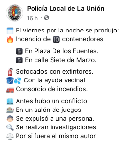 Los incendios tuvieron lugar en la plaza de los Fuentes y en la calle Siete de Marzo de la ciudad de La Unión, siendo sofocados con la ayuda vecinal y el consorcio de extinción de incendios. Desde la Policía Local se informa que antes tuvo lugar un conflicto en un salón de juegos y se investiga si hubo alguna relación. Indicar que el precio de cada contenedor es de unos 800 euros, con lo que este caso reponerlo costará 8.000 euros de dinero público.