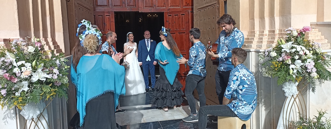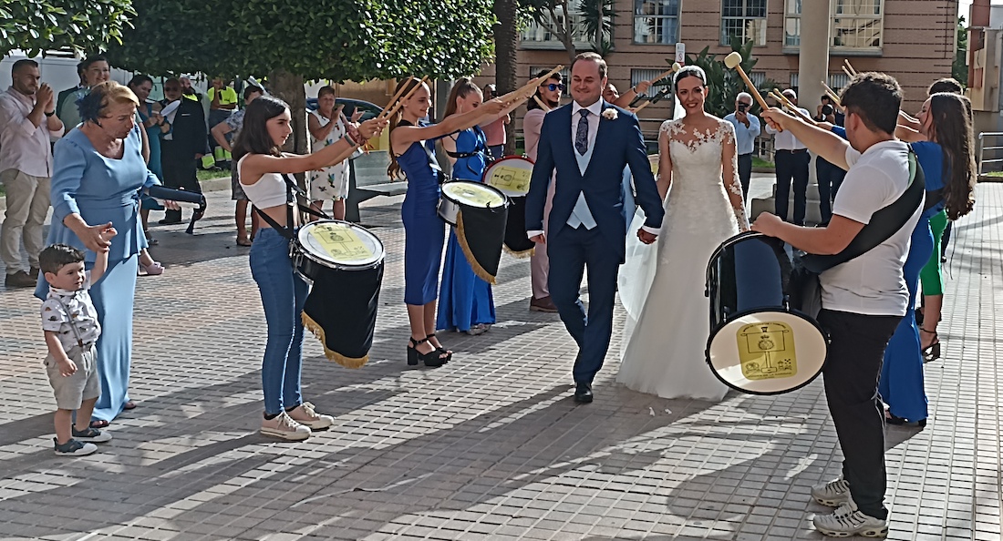 Arropados por familiares y amigos, la feliz pareja, tras superar la lluvia de granos de arroz, cruzó en la explanada exterior por el pasillo creado por los componentes de la banda de cornetas y tambores Virgen de la Caridad, de la que ambos están al frente, siendo José Antonio Martínez su director. Ambos también están ligados a la Semana Santa Minera dentro de la agrupación de la Virgen de la Caridad, en la que Laura Rodríguez es procesionista e integrante de su junta directiva. Tras la celebración, la fiesta se trasladó a un establecimiento de La Manga ubicado junto a la playa.