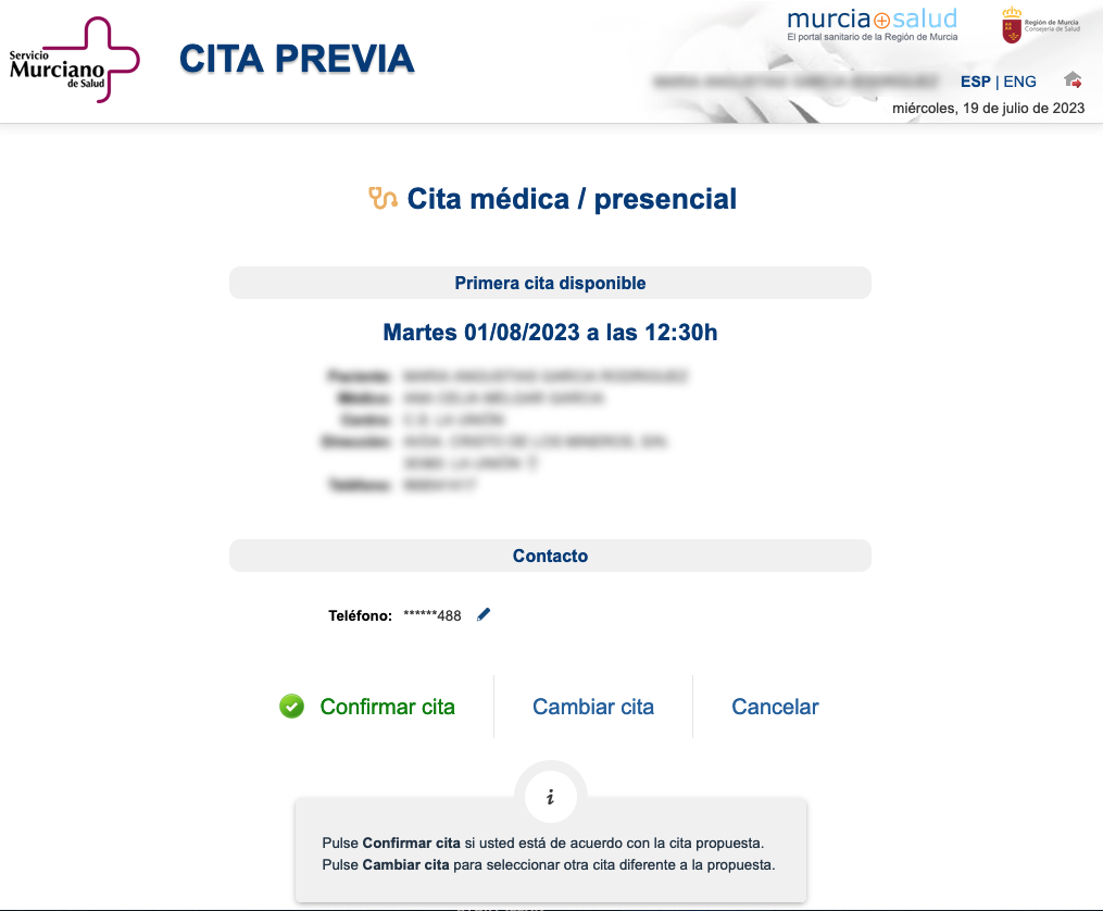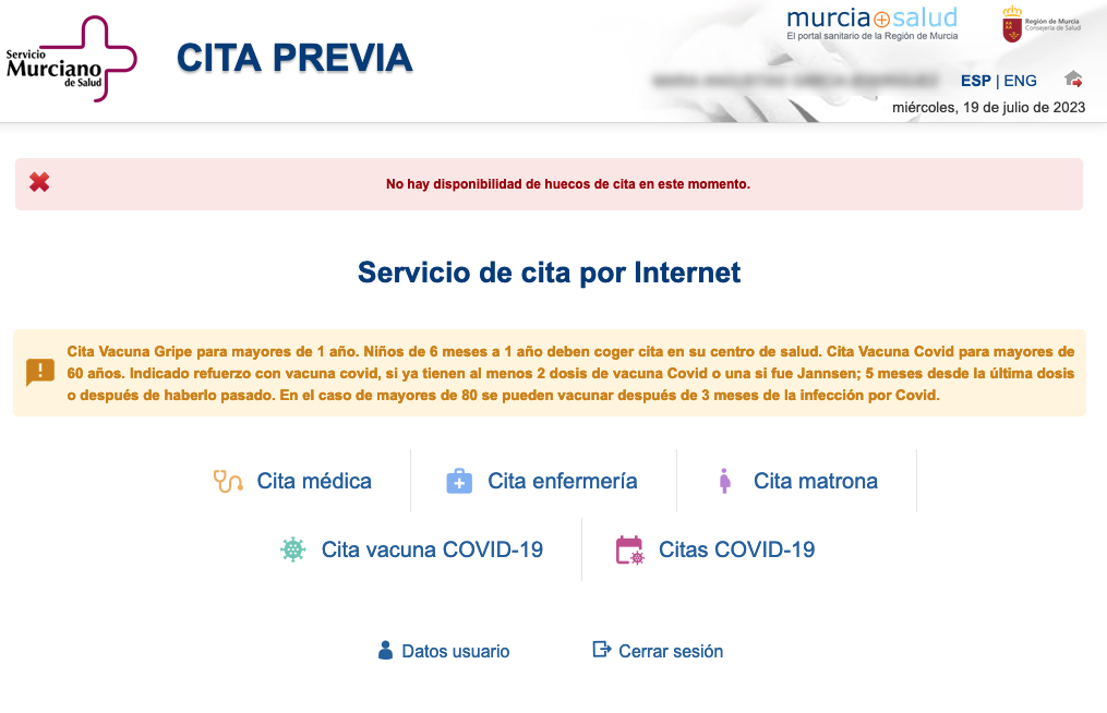 Una vecina se ha dirigido a nuestro 'Buzón de los lectores' aportando dos imágenes captadas ayer en la que solicitó consulta telefónica con su médico de atención primaria del centro de salud de La Unión y se encontró con el siguiente aviso: "No hay disponibilidad de huecos de cita en este momento". Entonces optó por pedir cita presencial y se la dieron para el uno de agosto. "Lo que está generando la consejería de Sanidad cada verano es que al final optemos por ir y sobrecargar los servicios de Urgencias", expone.