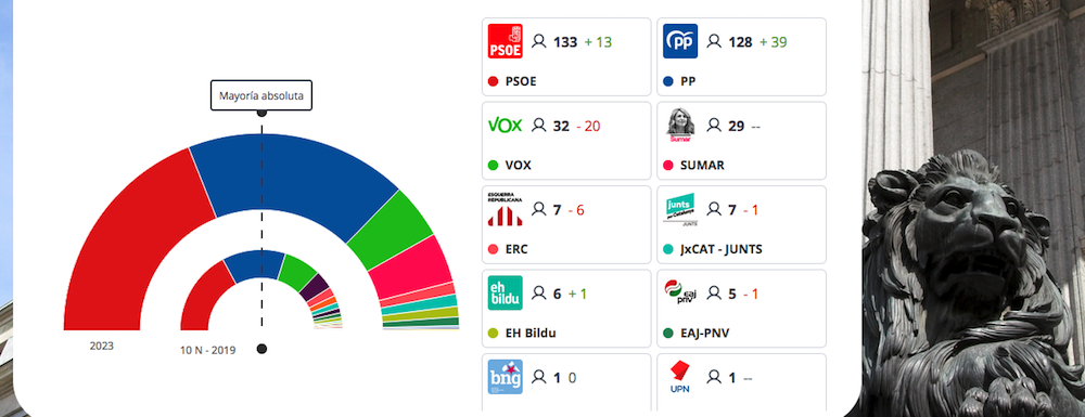 El partido socialista lleva 133 escaños por 128 el PP, seguidos ambos por VOX (32), Sumar (29), ERC (7) y JxCAT Junts (7).