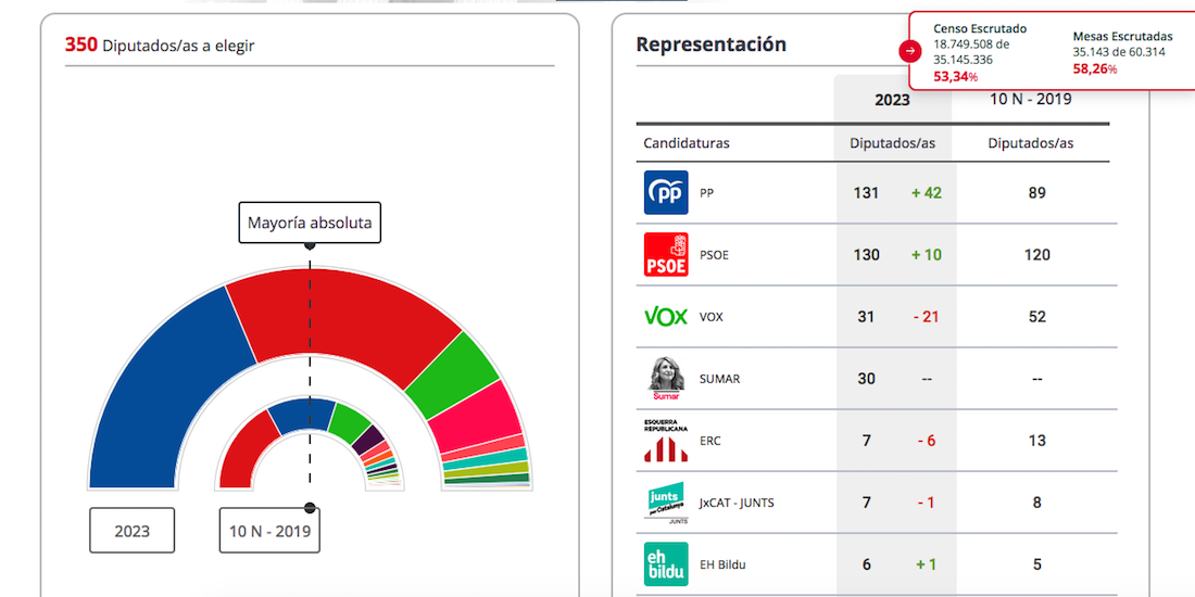 El Partido Popular, al 53,54% de las papeletas contabilizadas, lleva 131 escaños del Congreso de los Diputados por 130 el PP, seguidos ambos por VOX (31), Sumar (30), ERC (7), JxCAT Junts (7) y Bildu (6). Respecto a la Región de Murcia, la cifra está en PP (4), PSOE (3) VOX (2) y Sumar (1). En el Senado, tiene 94 senadores el PP por 78 el PSOE, seguidos con 11 de 'Izquierdas por la independencia'.