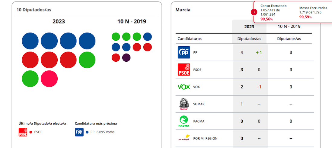La formación que lidera Abascal fue la más votada en 2019 y ahora pierde más de treinta mil votos y uno de los 10 escaños que corresponden a nuestro territorio autonómico en favor del PP, aportará 4 diputados, mientras que PSOE se mantiene con 3 y Sumar tendrá el restante. Al 99,11% del escrutinio, los ‘populares’ han recibido 304.244 papeletas por 186.210 los socialistas, 161.178 la formación verde y 70.155 los debutantes de Sumar.