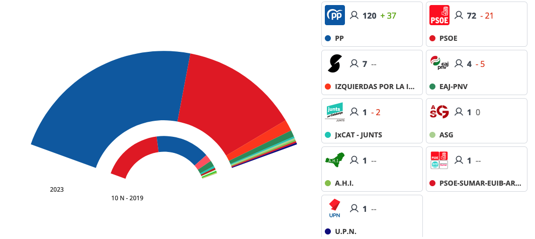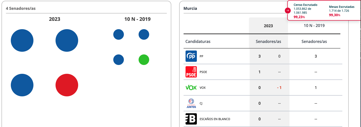 El unionense ha sido, con 3.427 papeletas, el candidato por la Región de Murcia más votado al Senado en los comicios generales del 23J, donde el PP mantiene los tres representantes mientras que PSOE desbanca en el restante a VOX. A nivel nacional, el PP sí logra en este capítulo mayoría absoluta con 120 escaños por 72 el PSOE. En la imagen se observa la presidente del Partido Popular de La Unión ayer mañana con apoderados y compañeros unionenses.