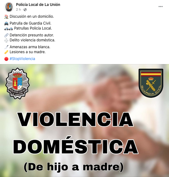 La Policía Local de La Unión informa que ha sido detenido un hombre como presunto autor de un delito de violencia doméstica por amenazas con arma blanca y causar lesiones a su madre.