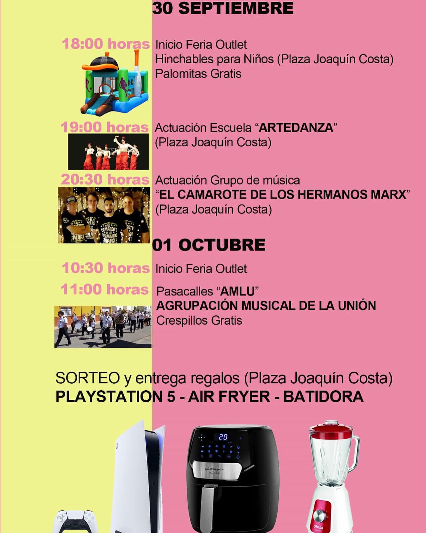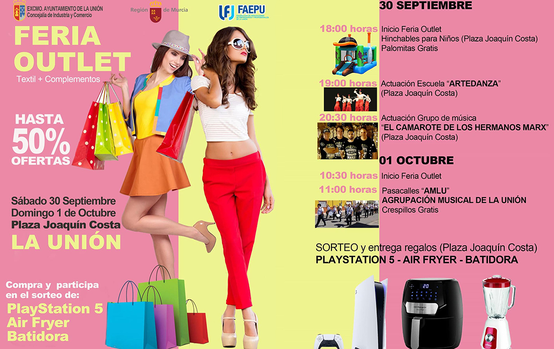 El Ayuntamiento de La Unión organiza el sábado y el domingo en la plaza de Joaquín Costa una 'Feria Outlet' con rebaja de precios de productos en los comercios instalados, amenizando las dos jornadas la música con 'El camarote de los hermanos Marx', la Agrupación Musical 'La Unión' y 'Artedanza', además de hinchables para los niños.