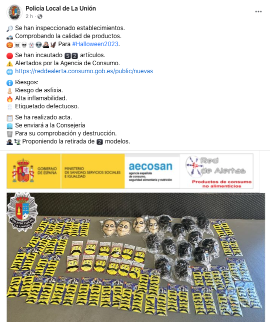 La Policía Local de La Unión, durante la labor de inspección de establecimientos, ha detectado algo más de medio centenar de productos relacionados con la fiesta de la víspera de 'Todos los santos' que pueden constituir un riesgo.
