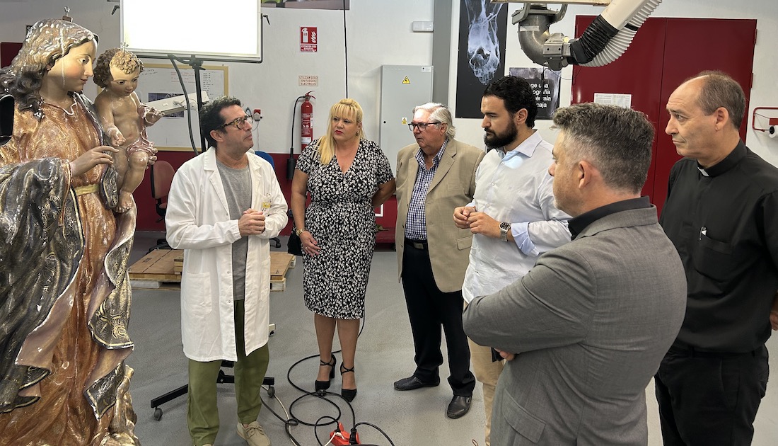El alcalde de La Unión ha visitado esta mañana el Centro de Restauración de la Comunidad Autónoma de la Región de Murcia (CRRM) para supervisar los trabajos que se están llevando a cabo en la imagen de la Patrona del municipio, la Virgen del Rosario, y que ya han entrado en su etapa final.