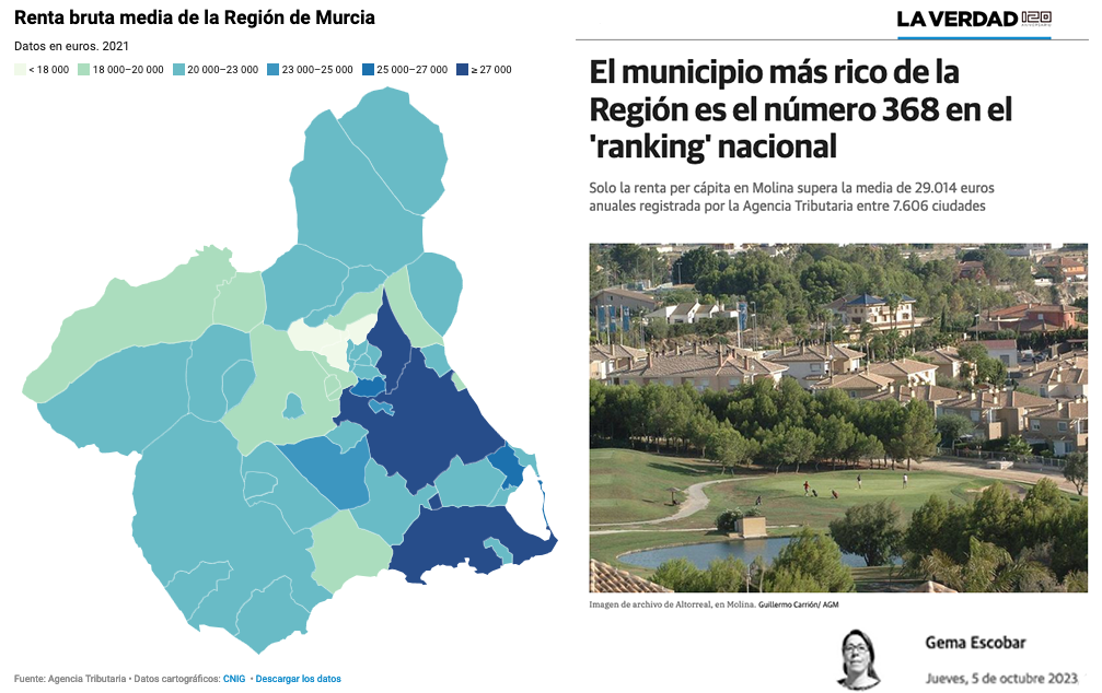 El municipio está en la zona media de una Región de Murcia en la que sólo Molina de Segura se sitúa por encima de la media nacional, según un artículo que la periodista Gema Escobar firma hoy en el diario La Verdad. Además del molinense, los municipios más ricos de nuestro territorio autonómico con Murcia (28.675 euros) y Cartagena (27.100), seguidos por Torres de Cotillas (25.740) y San Javier (25.570), mientras que Lorca (22.028) ocupa el puesto 15 y en la cola están Mazarrón (18.651), Moratalla (18.020) y Ricote /17.931).