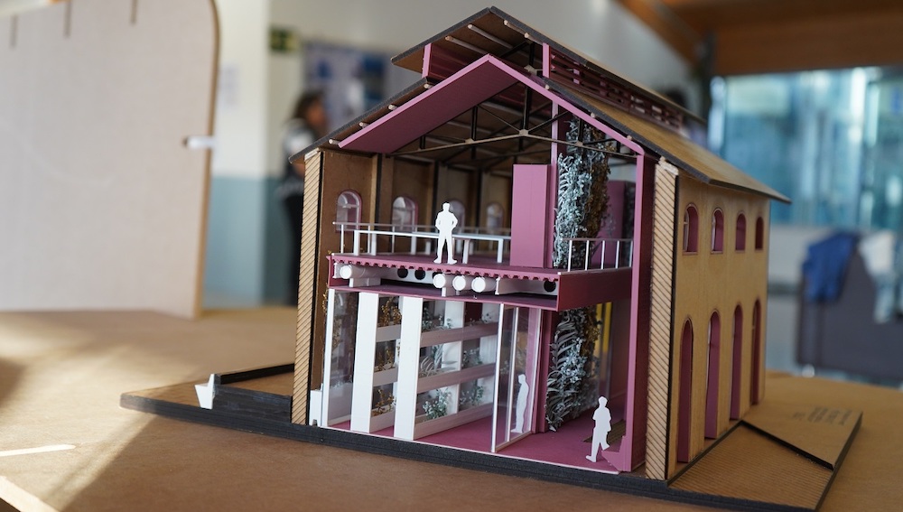 La propuesta de la ya arquitecta superpone la reutilización y revitalización de las naves preexistentes con un nuevo elemento arquitectónico con forma de T para salvar el gran desnivel que presenta el emplazamiento.