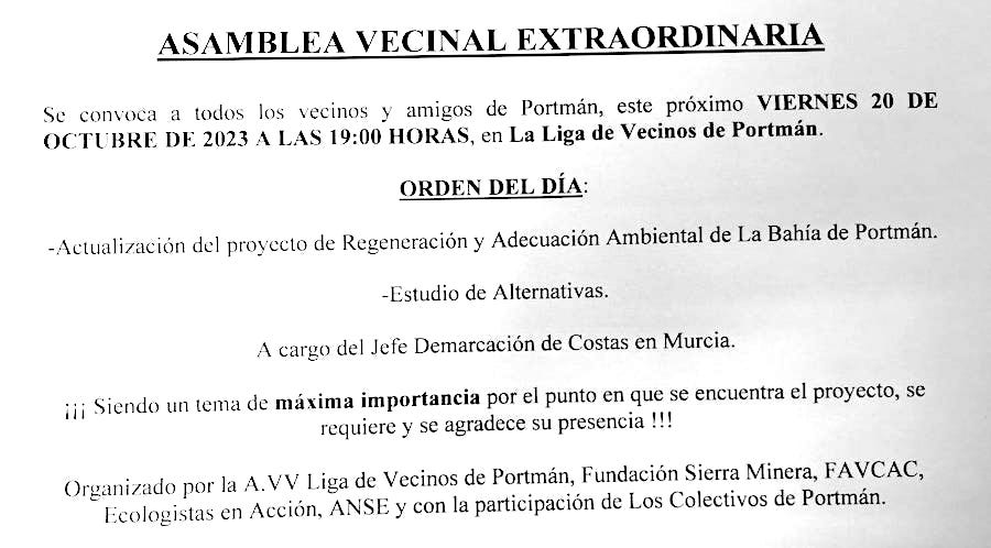 Los colectivos convocan una asamblea vecinal extraordinaria para este 20 de octubre, a partir de las 19 horas, en la sede de la Liga de Vecinos con un orden del día que incluye la actualización del proyecto de regeneración y adecuación ambiental y el estudio de alternativas. Ambos temas serán expuestos por el responsable de la Demarcación de Costas del Estado en la Región de Murcia. “Es un tema de gran importancia por el punto en el que se encuentra el proyecto”, indican los convocantes.