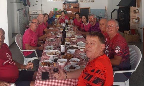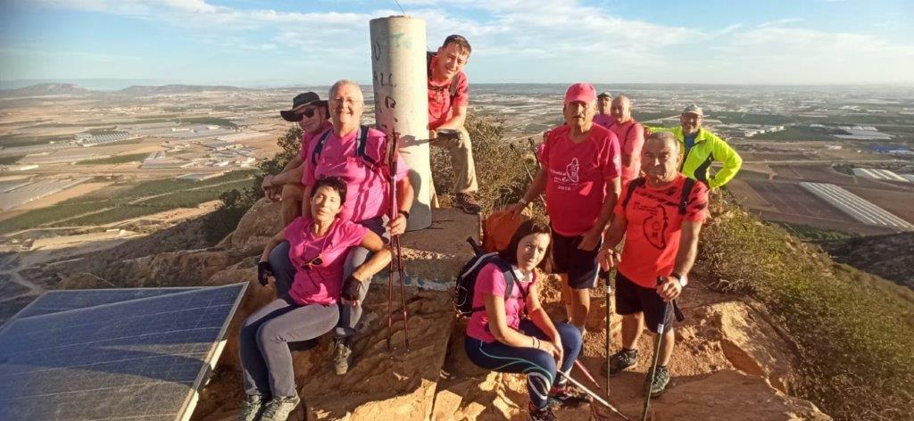 Una vez culminada la ascensión, y previo descanso con sus fotos correspondiente, se inició la bajada por una zona de piedra suelta donde se tenía que poner en marcha toda la pericia de los concurrentes. El regreso se volvió a efectuar por el túnel de inicio, ya que las otras zonas están valladas, para regresar y pasar al cercano pueblo de Torre Pacheco, donde la familia Vera-Fernández, nos tenían preparado un gran almuerzo como celebración del cumpleaños de Antonio, quien fue el que eligió esta ruta para su gran día.