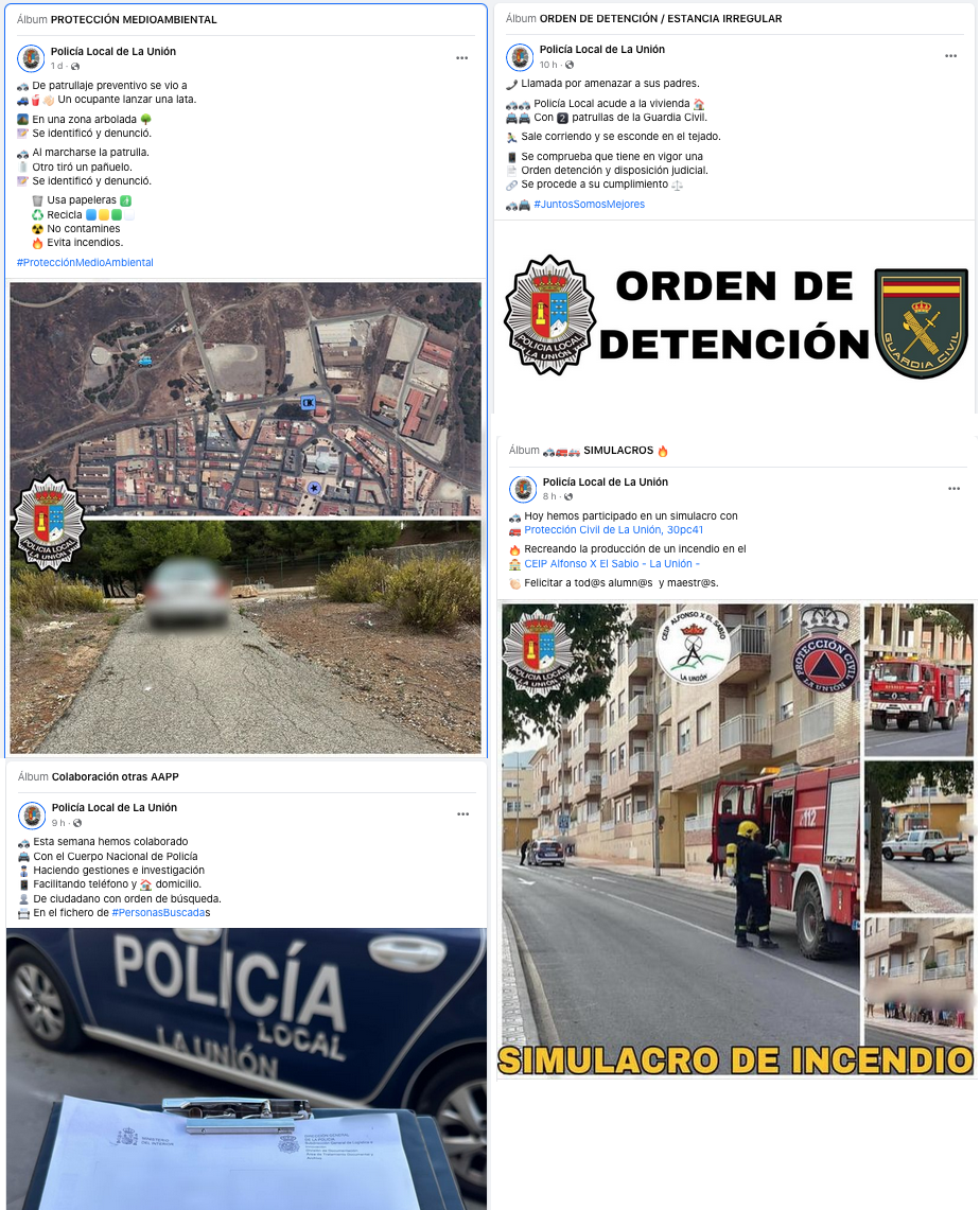 Esta actuación figura entre las llevadas a cabo por la Policía Local de La Unión en las últimas jornadas, al igual que otras por amenazar con una llamada a sus padres (el presunto autor se escondió en el tejado al llegar los agentes). También hubo colaboración con la Policía Nacional para localizar a un ciudadano con orden de búsqueda. Además, hoy han colaborado con Protección Civil en un simulacro de incendio en el colegio Alfonso X El Sabio.