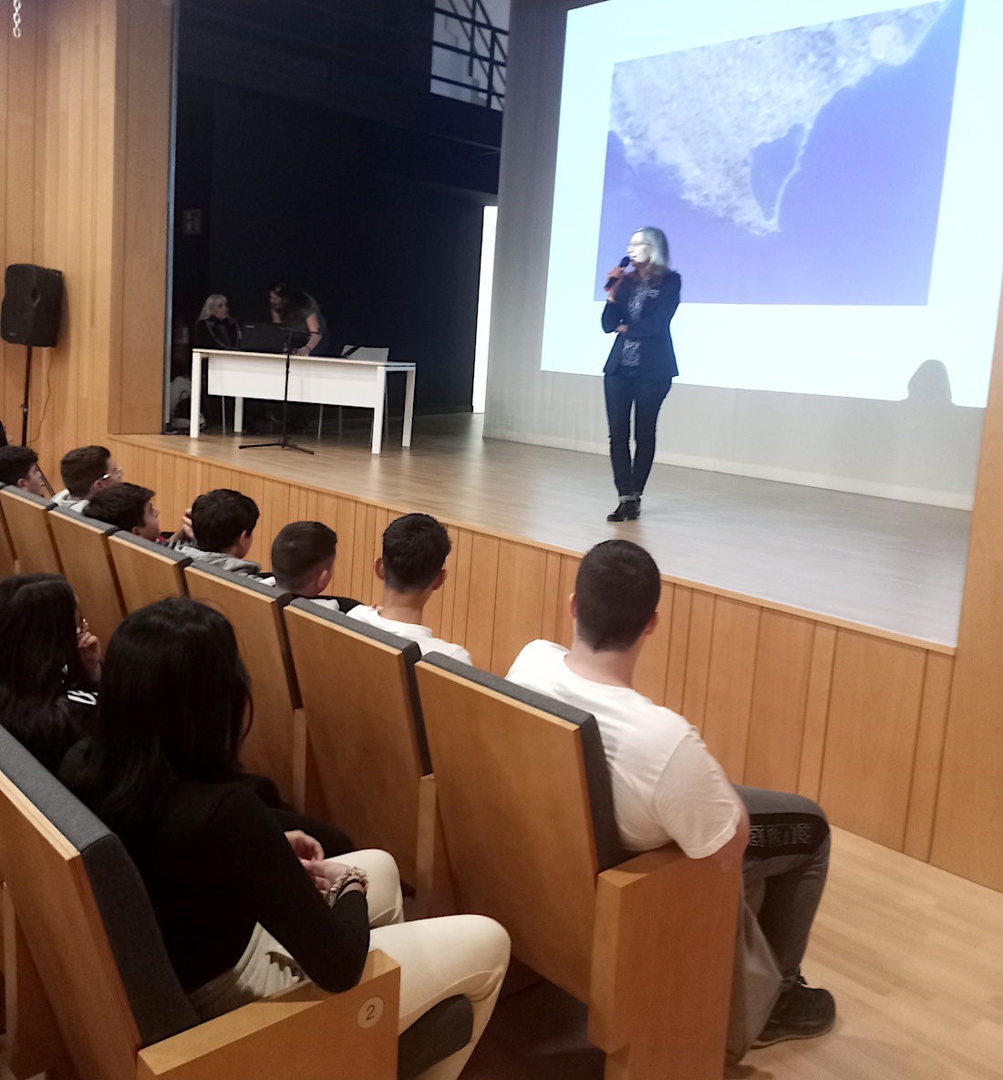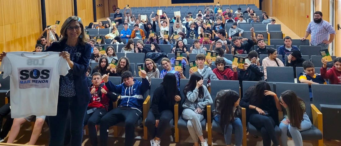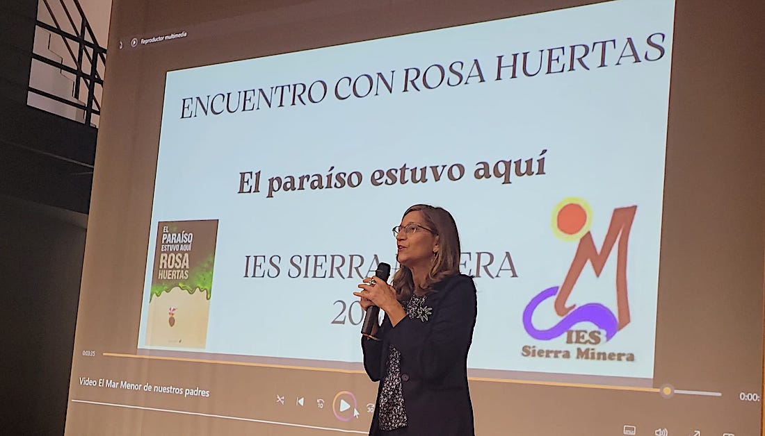 'El paraíso estuvo aquí' tiene como temática el estado de Mar Menor en el pasado y en la actualidad. El encuentro entre la autora y los alumnos ha permitido compartir impresiones y los alumnos han presentado sus trabajos sobre la obra. También se ha reivindicado el estado del 'paraíso' del que se habla en la novela (el Mar Menor) y del gran papel que tienen nuestros jóvenes en la lucha por su regeneración.