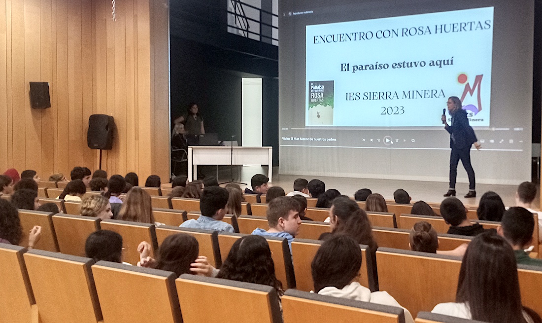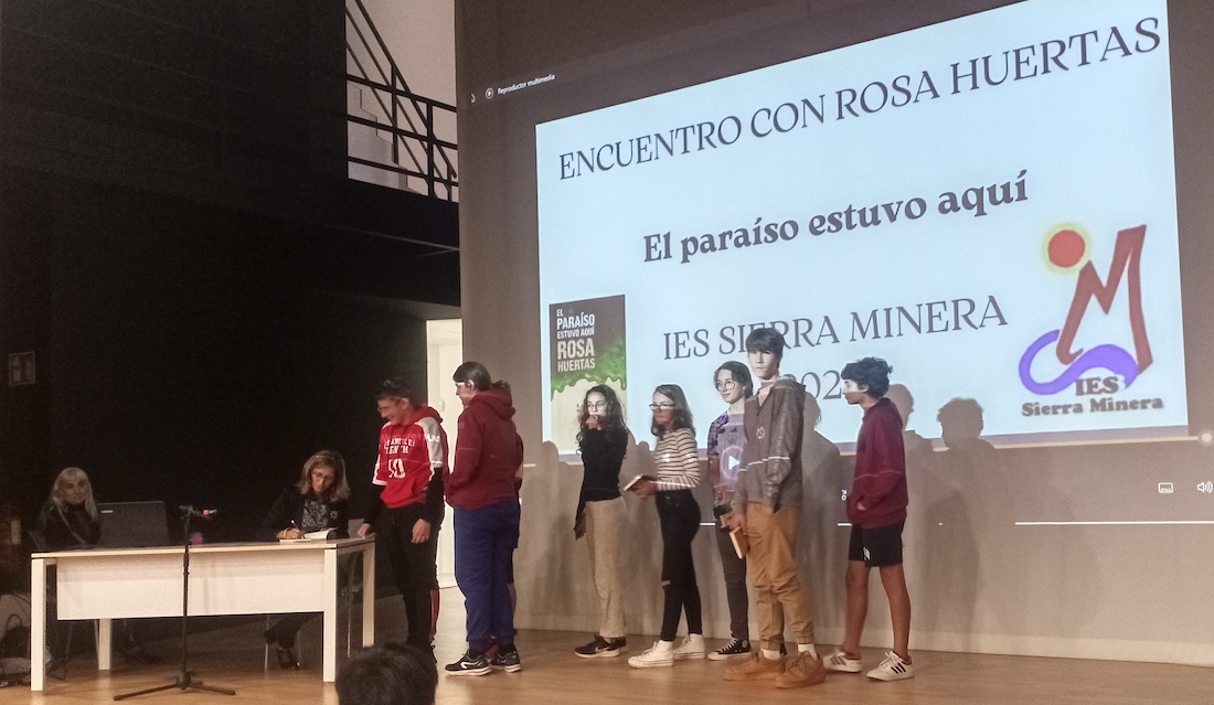 Alumnos de tercer curso de ESO del IES Sierra Minera, más un grupo de segundo, han mantenido un encuentro en el salón de actos del Museo Minero de La Unión con Rosa Huertas, importante escritora española de literatura infantil y juvenil, autora de la obra 'El paraíso estuvo aquí, el cual han leído los estudiantes para después mantener un coloquio con la madrileña.