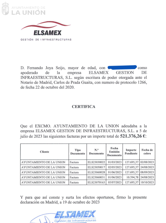 'El alcalde de La Unión desvela las deudas heredadas del gobierno socialista'El alcalde de La Unión, Joaquín Zapata, ha resaltado en el pleno de esta mañana las deudas en las que se encuentra sumido el consistorio municipal. Entre ellas, la del alumbrado público por una cantidad de 521,376 euros. (Ver imagen 1)