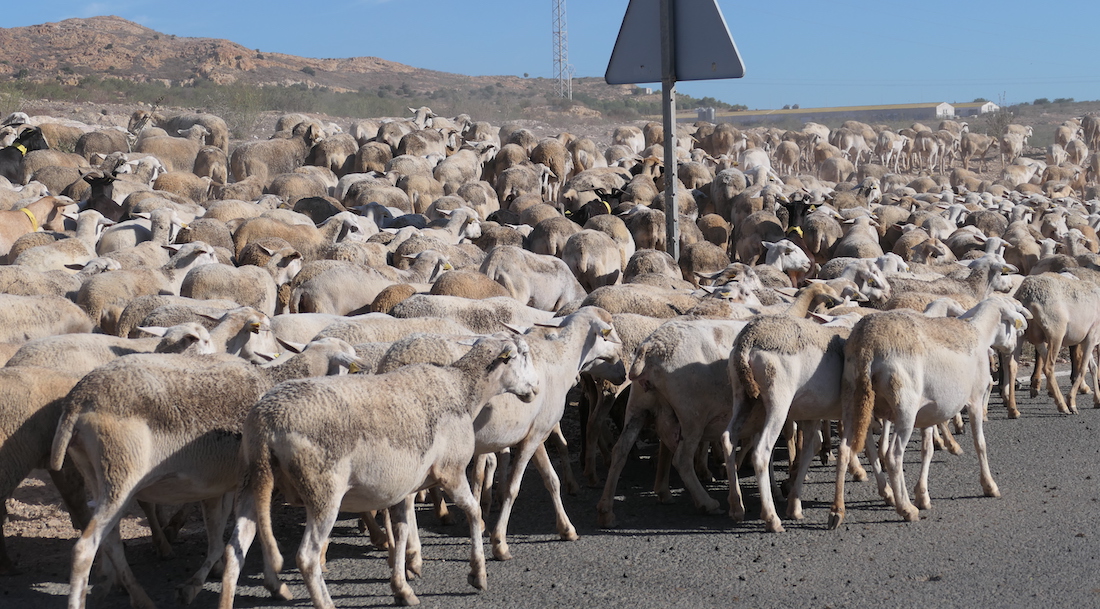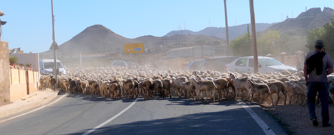 Escenas del paso de un rebaño de ovejas por Roche y su entorno, en el que pudo contemplar la habilidad del pastor y su canino equipo para guiar al numeroso grupo en busca de pastos.