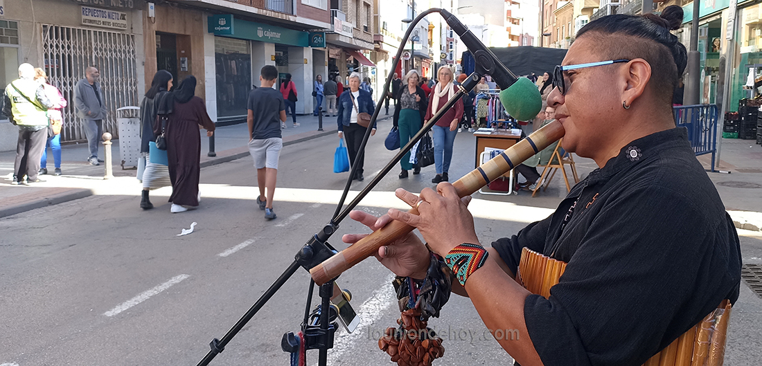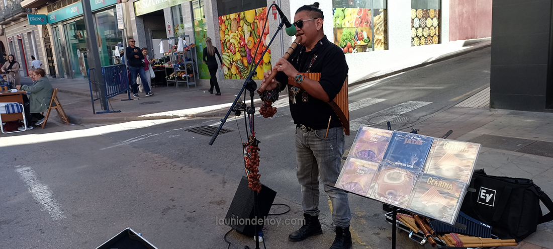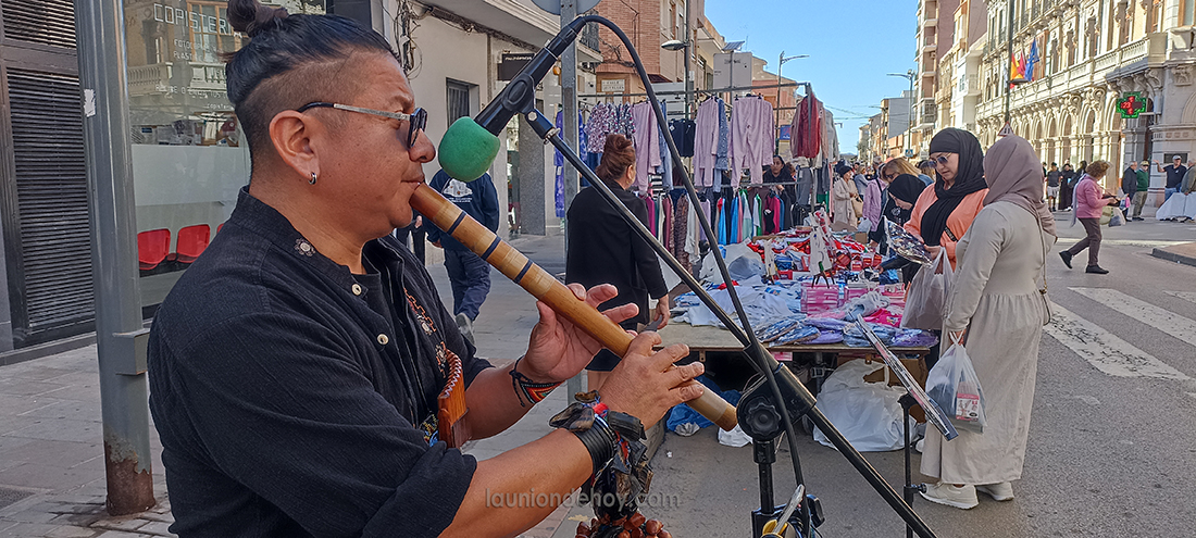 La agradable música acompañó a vendedores y compradores durante el mercadillo de ayer, a la altura de la Casa del Piñón en la calle Mayor. El artista se llama Julio y es conocido en el mundo artístico por 'Jatak Music', quien, al quedarse en el paro laboral, se lanzó a ser músico callejero. En la foto se le observa con la flauta típica de madera tocando y una flauta de pan bajo el brazo, que después tomó el relevo para generar otra sonoridad.