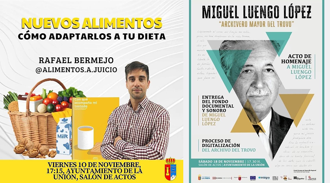 El salón de actos de la sede del Ayuntamiento de La Unión acoge esta tarde una conferencia sobre cómo adaptar nuevos productos a la alimentación diaria y el sábado 18 será cuando se lleve a cabo un homenaje a Miguel Luengo, quien ha entregado su fondo documental y sonoro al Archivo Municipal unionense.