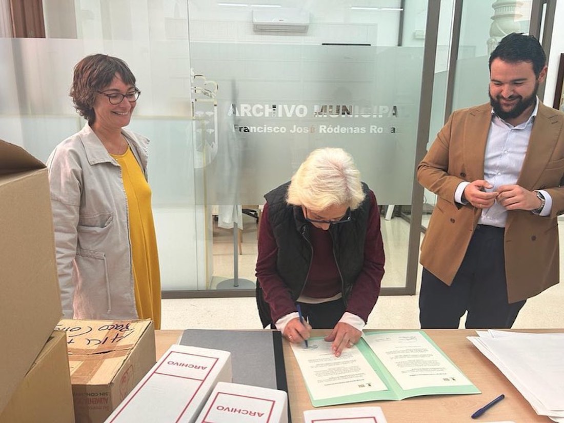 En el acto de entrega de la donación, el alcalde estuvo acompañado por un representante de la familia de Paco Conesa y la artista Julia Bermúdez.