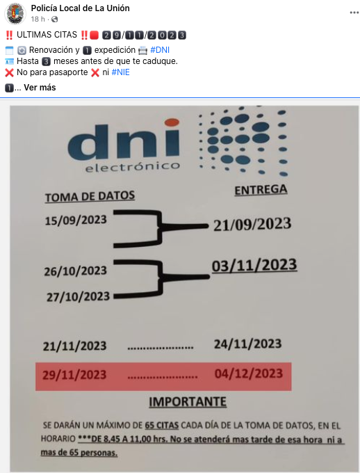 La Policía Local de La Unión informa que las próximas citas para renovación o expedición del documento nacional de identidad se pueden coger en las dependencias de su cuartel los días 21 y 29 de este mes. El tope de números es de 65.
