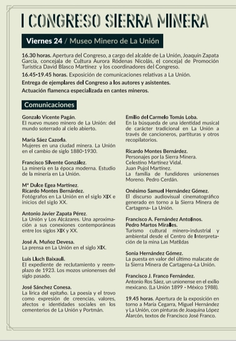 La inauguración del viernes día 24 tendrá lugar en el Museo Minero de La Unión a cargo del alcalde y posteriormente se realizarán diferentes ponencias relativas al municipio, de la mano de diversos expertos en la materia. Tras las conferencias, a las 19.45 horas se realizará la apertura de la exposición en torno a María Cegarra, Miguel Hernández y La Unión, con pinturas de Joaquina López Alarcón y textos de Francisco José Franco.