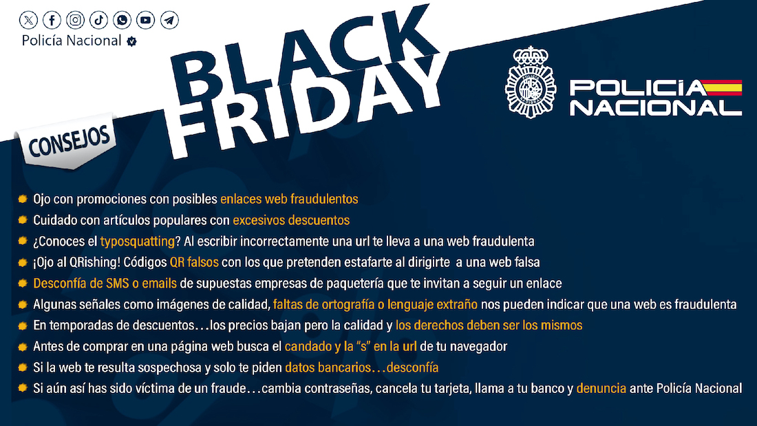 Ante el previsible aumento de compras de cara al Black Friday y el Cyber Monday, expertos de la Policía Nacional han elaborado un decálogo para evitar posibles fraudes que se pueden producir en los próximos días. Las redes sociales en ocasiones se han convertido en fuente de entrada para la difusión de estafas, los ciberdelincuentes las pueden utilizar para ofertar artículos llamativos que no existen o para redirigir a páginas fraudulentas