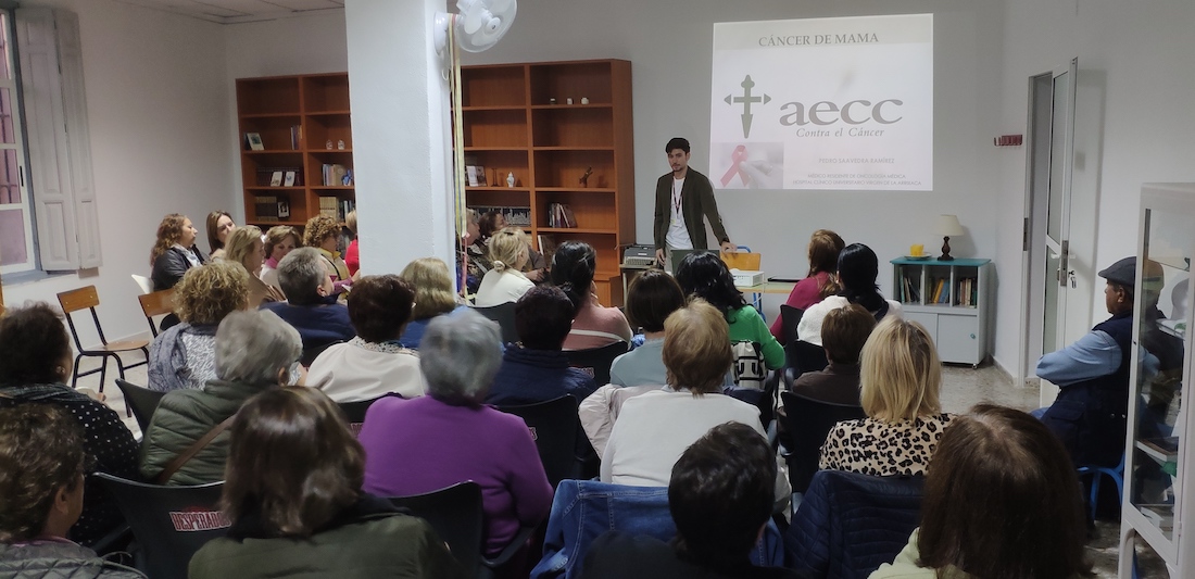 El doctor Pedro Saavedra, en la charla organizada por las amas de casa de la villa de El Garbanzal, desvela que también se han dado, aunque en bastante menor medida, casos entre varones. El galeno ha destacado que es esencial estar informado y tomar medidas preventivas para reducir el riesgo de desarrollo de esta enfermedad, siendo claves la conciencia y la educación en esa lucha, además de la autoexploración.