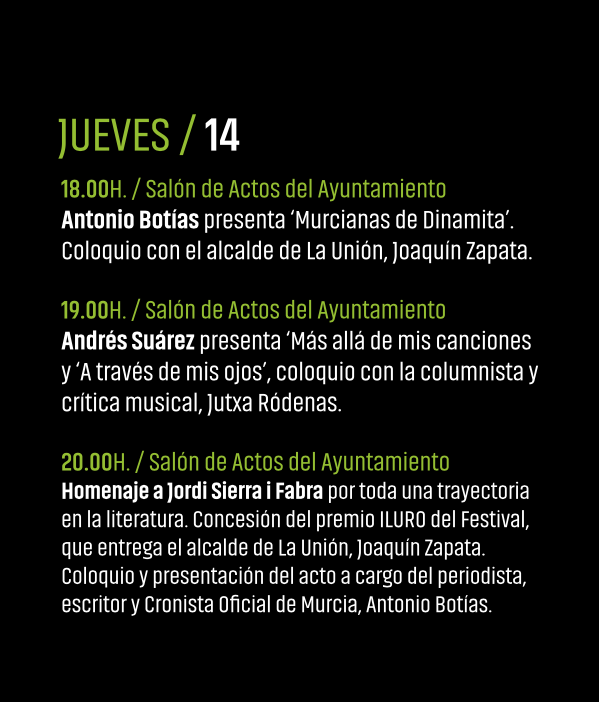 El clásico de 'El lazarillo de Tormes', obra anónima del siglo XVI, será representada a las 19.30 horas en el centro cultural Asensio Sáez. Además, a partir de las 18 horas siguen los actos de 'iLuro', el primer festival de literatura de La Unión, incluyendo el homenaje y entrega de distinción a Jordi Sierra y Fabra, referencia de la literatura infantil y juvenil.