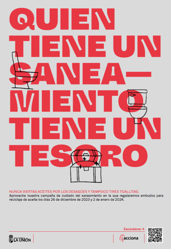 La campaña se ha podido ver en forma de cartelería en diferentes locales, comercios y edificios públicos del municipio desde el pasado 19 de noviembre en que se celebró el Día Mundial del Saneamiento, una iniciativa de las Naciones Unidas que tiene como objetivo concienciar a la población e impulsar aquellas acciones que permitan hacer frente a la crisis del agua y el saneamiento. Además, se instalarán MUPIS repartidos por La Unión, Roche y Portmán, y se podrá seguir aprendiendo sobre el cuidado del saneamiento en el test digital , para así poder llegar al mayor público posible.