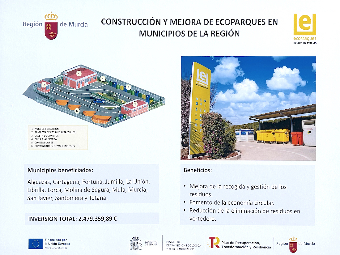 La Comunidad Autónoma concede ayudas por casi 2,5 millones de euros para ejecutar proyectos de construcción y mejora de 13 puntos limpios (ecoparques) en otros tantos municipios de la Región de Murcia. Estas ayudas están cofinanciadas por el Plan de Recuperación, Transformación y Resiliencia (PRTR) de la Unión Europea.