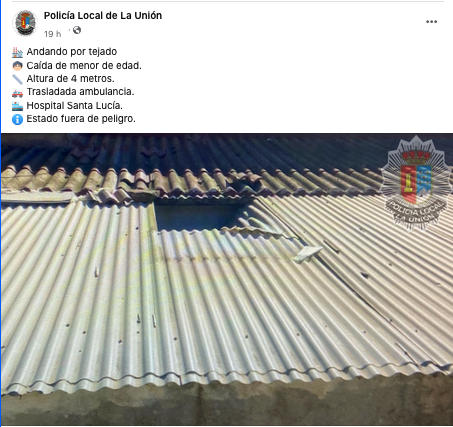 La Policía Local de La Unión informa que un menor de edad sufrió una caída de unos cuatro metros de altura cuando iba por la cubierta de policarbonato de un inmueble, la cual se rompió. Fue trasladado en ambulancia al hospital, estando fuera de peligro.