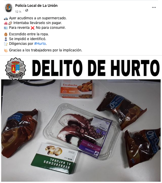 La Policía Local de La Unión informa que ayer acudió a un establecimiento de venta de alimetnos donde una persona se intentaba llevar productos escondidos en su ropa con el objetivo de no pagarlos, para luego revenderlos. Al autor se le han abierto diligencias por un delito de hurto. Los agentes agradecen la implicación de los trabajadores.