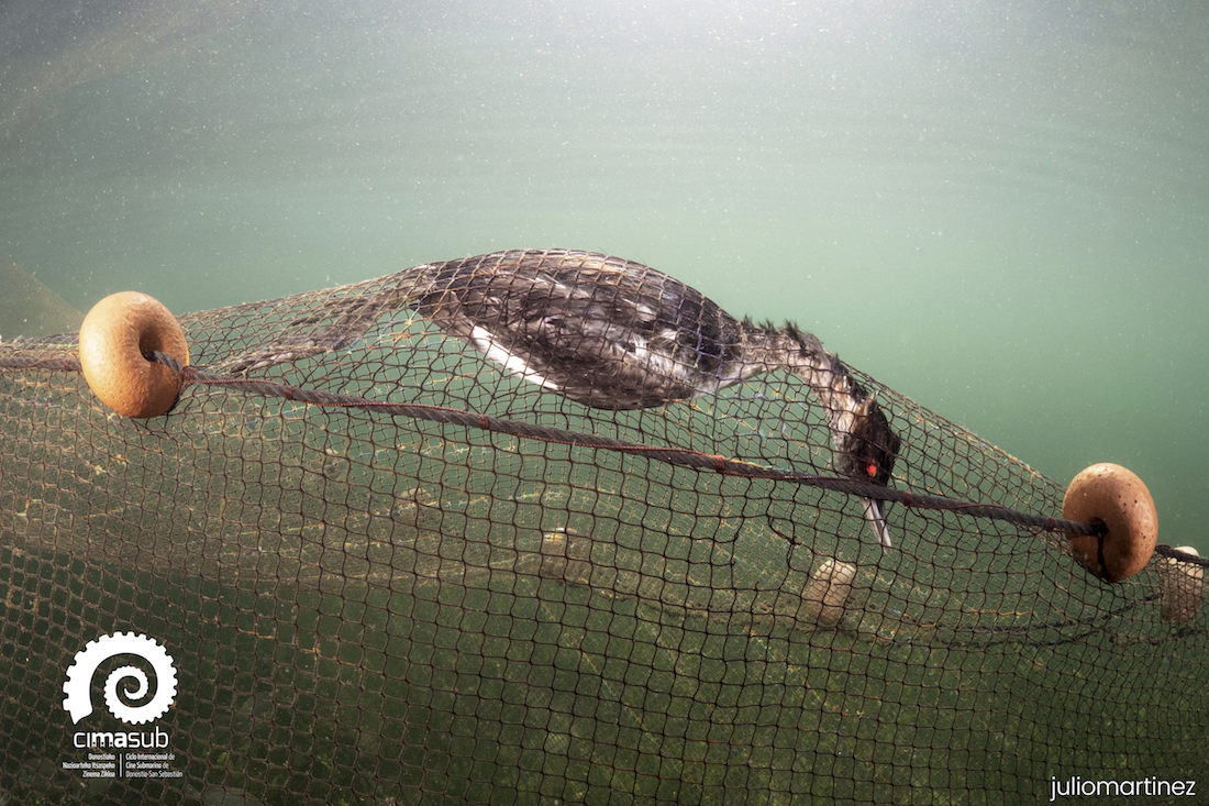 "Inocente" es una fotografía realizada en aguas del mar Menor que aborda la problemática de las capturas accidentales en determinadas artes de pesca. Se trata de un Zampullín que, atraído por la presencia de alimento, se introduce en la red y al intentar alcanzar la superficie queda fatalmente atrapado, explica Julio Martínez, quien también resalta que el trabajo colaborativo de "cofradías de pescadores, científicos, conservacionistas y administraciones es fundamental para buscar e implementar soluciones. Nosotros, con la fotografía, aportamos ese granito de arena para promover la concienciación ambiental y festivales tan importantes como el Cimasub, con sus proyecciones y exposiciones, hacen que esta concienciación llegue a cuanta más gente mejor y en especial a los más pequeños", expresa este fotógrafo submarino unionense cuya labor se centra, fundamentalmente, en aguas de Cabo de Palos, Portman, Mar Menor y Cartagena.