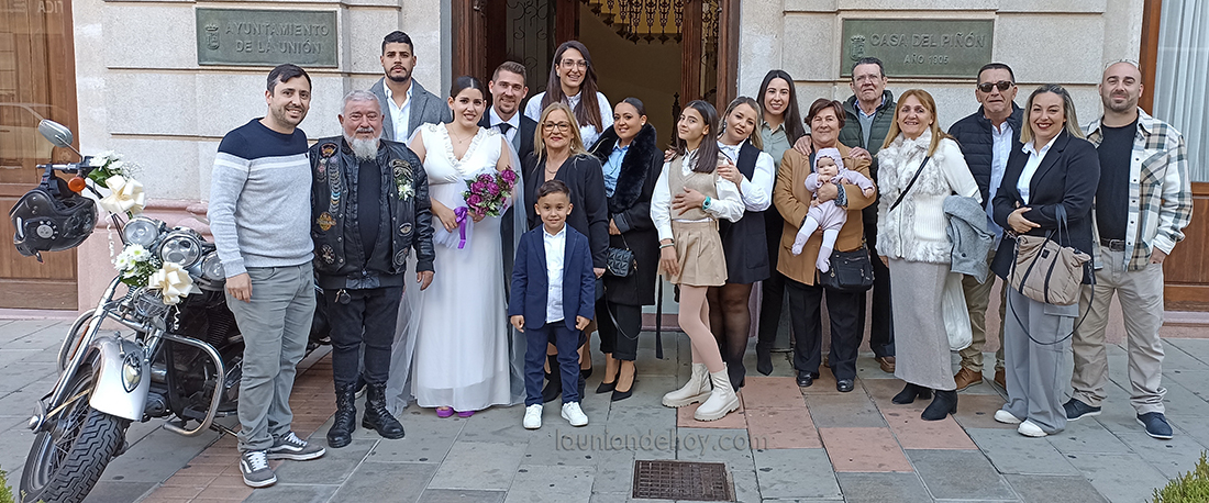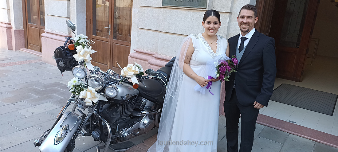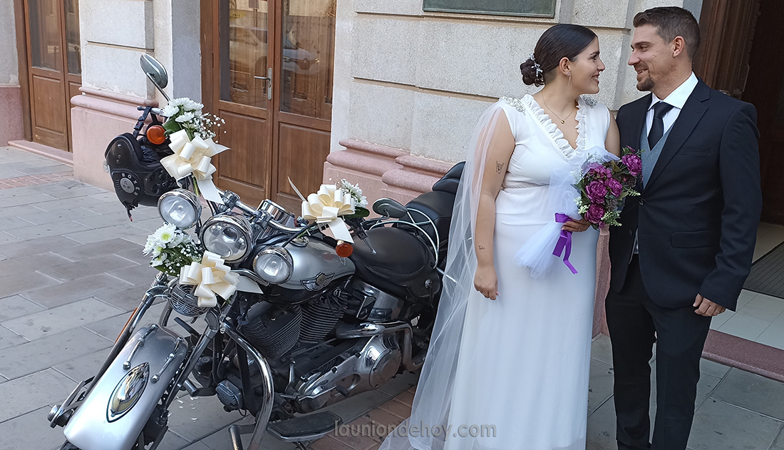 Paula y Manuel contrajero matrimonio ayer en el modernista edificio de la Casa del Piñón arropados por amigos y familiares. En la fotografía posan junto a la motocicleta de los padres de ella, que son activos moteros.