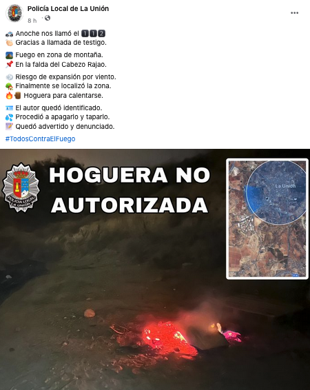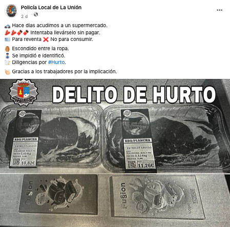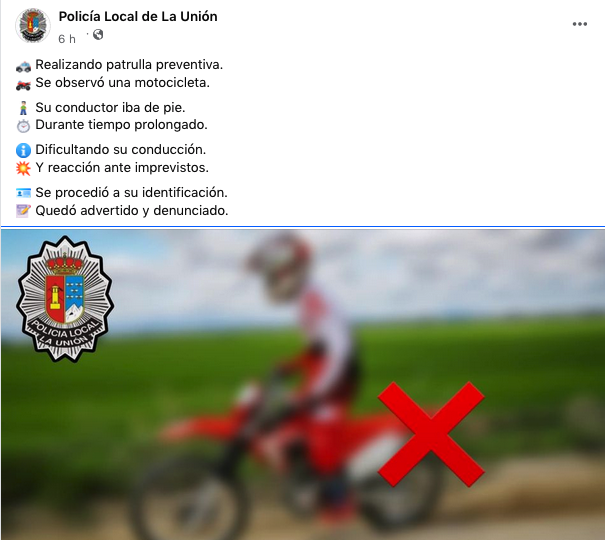 Una patrulla de la Policía Local de La Unión detectó que el piloto mantenía esa irregular posición sobre su montura en movimiento durante un tiempo prolongado, por lo que fue denunciado. El cuerpo policial también informa de un nuevo hurto en un supermercado y de un fuego no autorizado prendido en la falda del Cabezo Rajao.