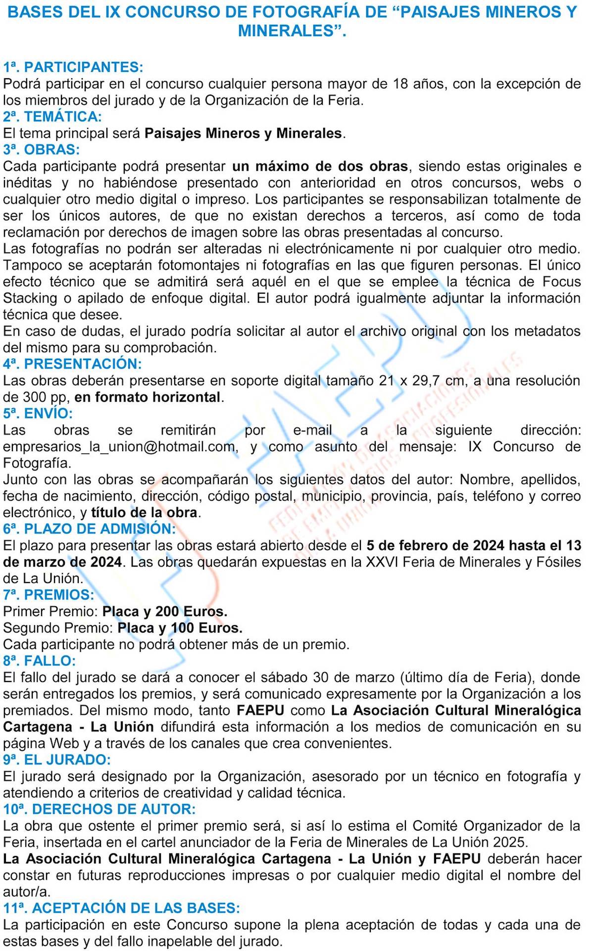 La federación de empresas y comercios de La Unión (FAEPU) y la Asociación Cultural Mineralógica Cartagena-La Unión organizan la novena edición del certamen, que admitirá imágenes hasta el 13 de marzo. El primer premio está dotado con 200 euros y el segundo, con 100, además de sendas placas. Las obras deben ir en formato horizontal con unas medidas de 21x29,7 centímetros y una resolución de 300 pp.