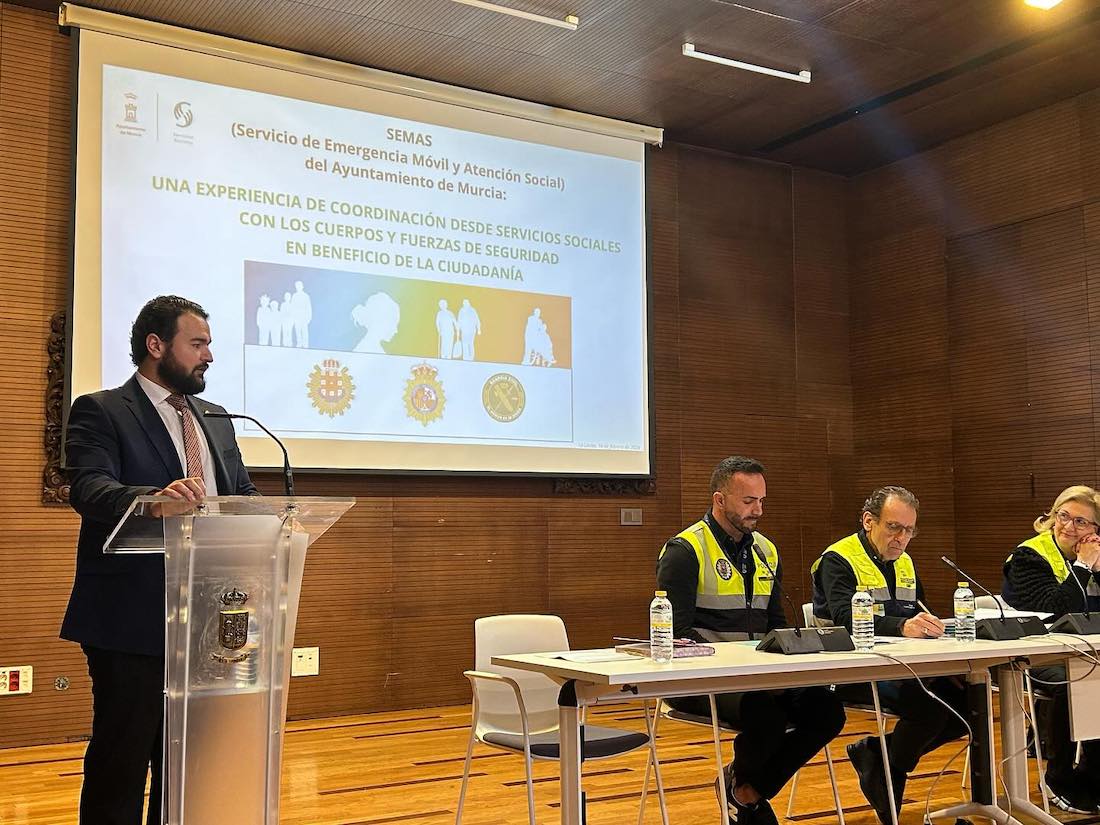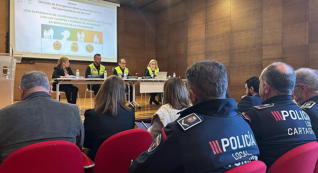 El salón de actos de la Casa de Piñón acogió el encuentro de profesionales ‘Una experiencia de coordinación desde Servicios Sociales con los cuerpos y fuerzas de seguridad en beneficio de la ciudadanía’ realizada por el SEMAS (Servicio de Emergencia Móvil y Atención Social) del Ayuntamiento de Murcia en coordinación con Servicios Sociales de La Unión.