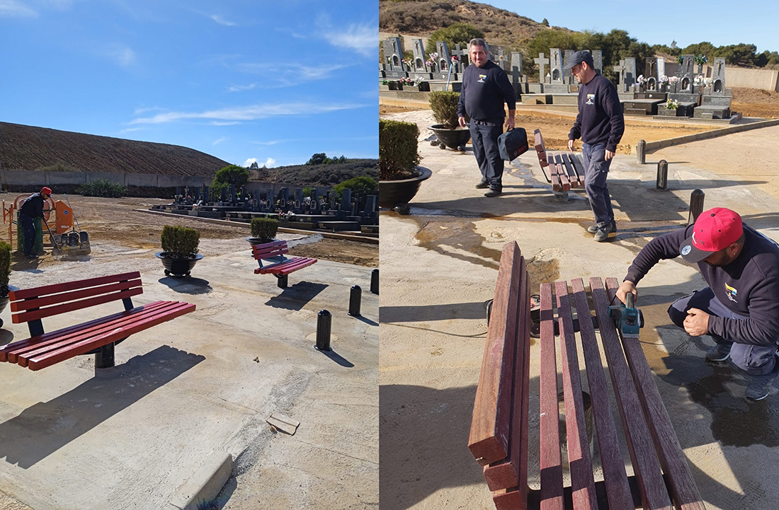 Finalmente se han instalado 2 bancos rehabilitados, bolardos y jardineras para el buen aprovechamiento de los visitantes del cementerio.
