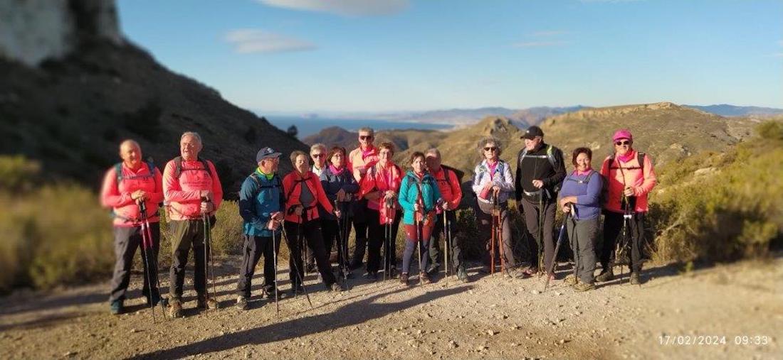 ... por ramblas, para lo que el colectivo senderista unionense se desplazó al centro social de Perín (Cartagena), y desde allí pasar por la minigranja El Huertecico, para subir por la rambla de Los Barbastres y el deposito de Juan Paca hasta las estribaciones de peñas Blanca, para una vez allí, coger una senda un tanto dificultosa hasta llegar a la senda oficial que pasa por todos los cabezos, sin llegar al Palmeral, por donde se inició la bajada.