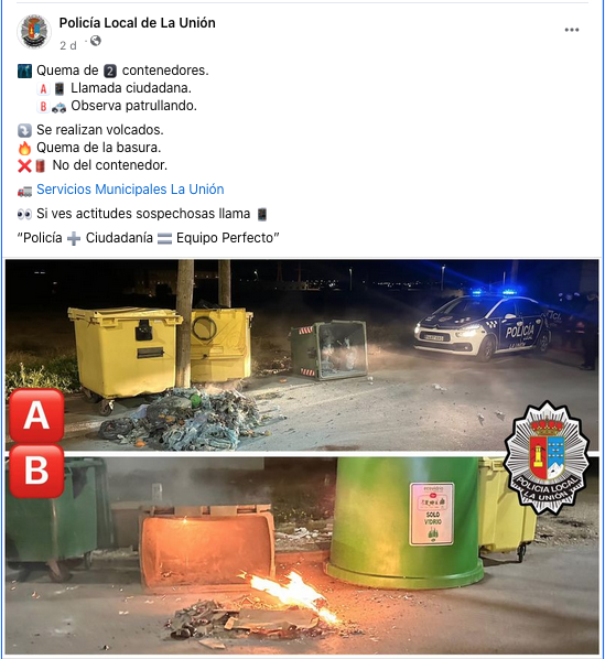 Nuevo casos de contenedores quemados en La Unión que se suman a los registrados las semanas anteriores. Parece claro que son intencionados. Cada contenedor cuesta un mínimo de unos ochocientos euros (según modelo), cuya reposición se paga del dinero público municipal.