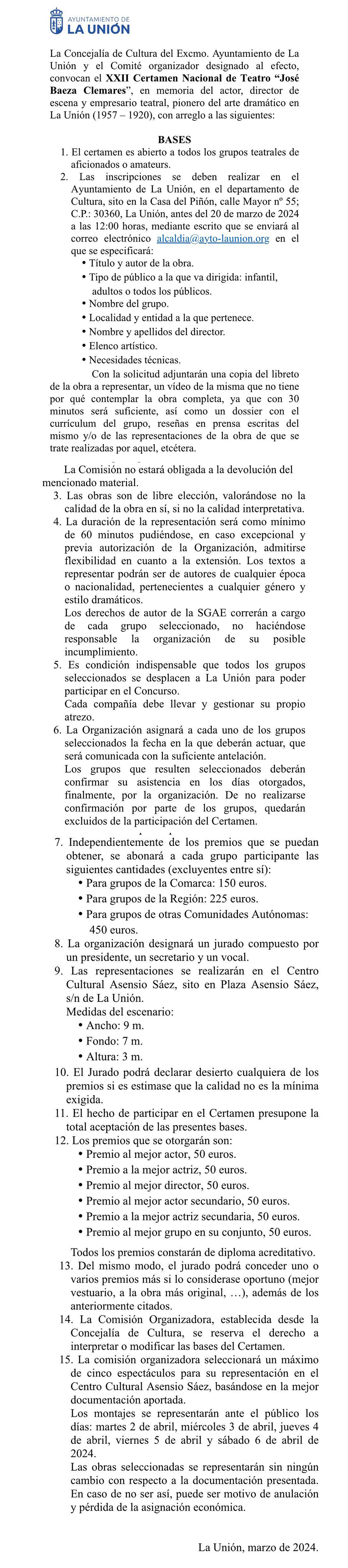 Las compañías puede apuntarse hasta el 20 de marzo a una edición que se celebrará en el centro cultural 'Asensio Sáez' de l 2 al 6 de abril y que otorgará seis premios dotados con 50 euros cada uno. El concurso lleva el nombre de quien fue actor, director y empresario teatro, pionero en el arte dramático de La Unión (1857-1920), quien destacó tanto en la comedia como en el drama y que tiene una calle con su nombre en la ciudad.