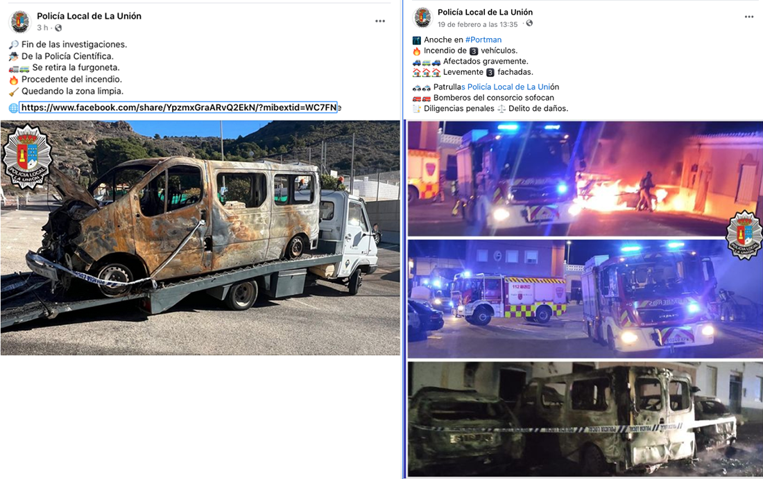 La Policía Local informa que la policía científica del CNP ha concluido las investigaciones para averiguar las causas que originaron que ardieran varios coches y una furgoneta en la noche del 18 de febrero en Portmán, con lo que han sido retirados, quedando la zona limpia.