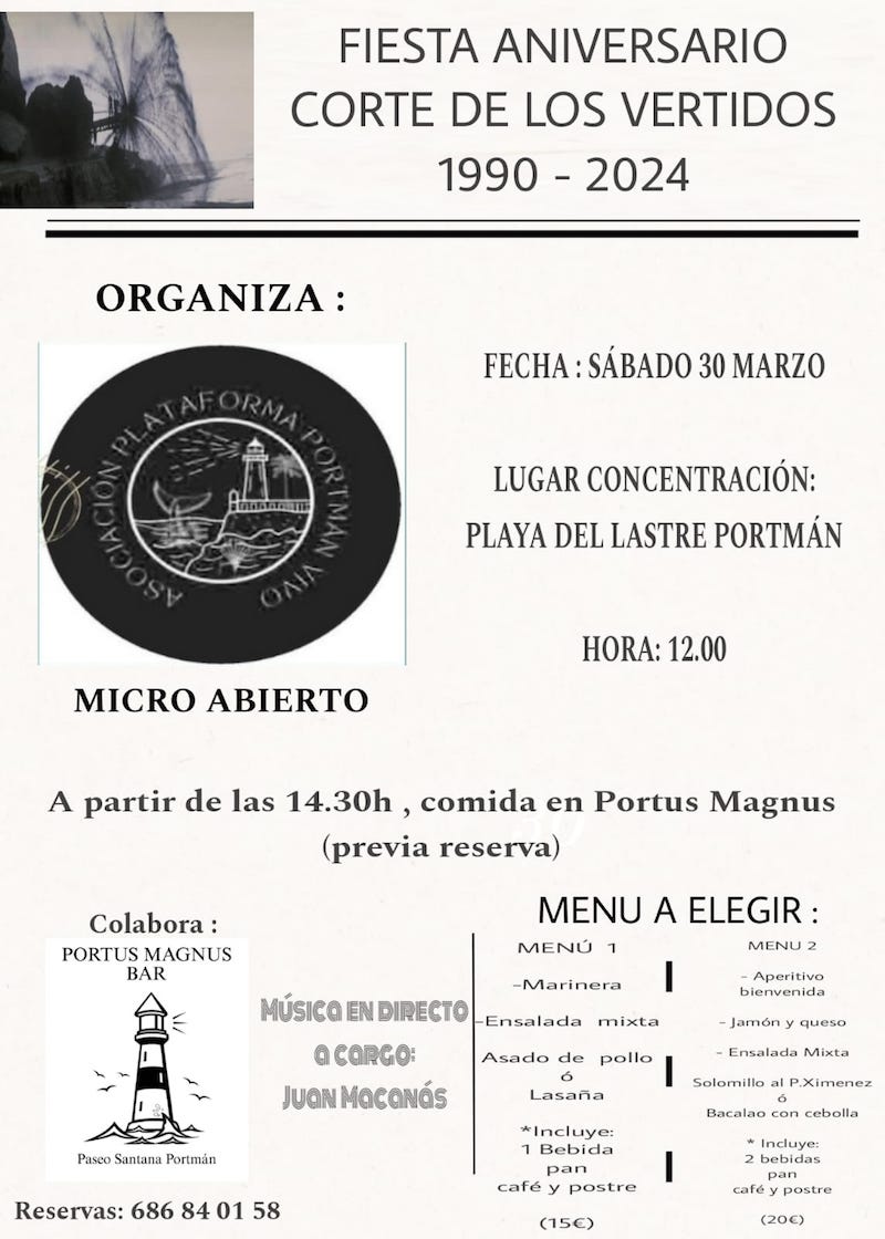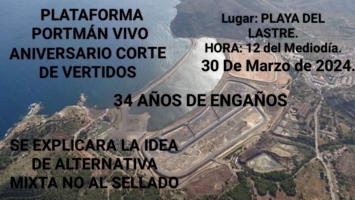 La Plataforma Portmán Vivo invita a participar por el cese de los vertidos en Portmán hace 34 años. Además explicarán la alternativa mixta 'No al sellado'. Invitan a acudir a la Fiesta por el cese de los vertidos en Portmán, 1990-2024, son 34 años del cese, un 30 marzo de 1990.También es motivo no sólo de celebración, sino de reivindicación, para conseguir recuperar una bahía aterrada, por eso sobre las 12, la Plataforma Portmán Vivo explicará la idea de alternativa Mixta NO al sellado.