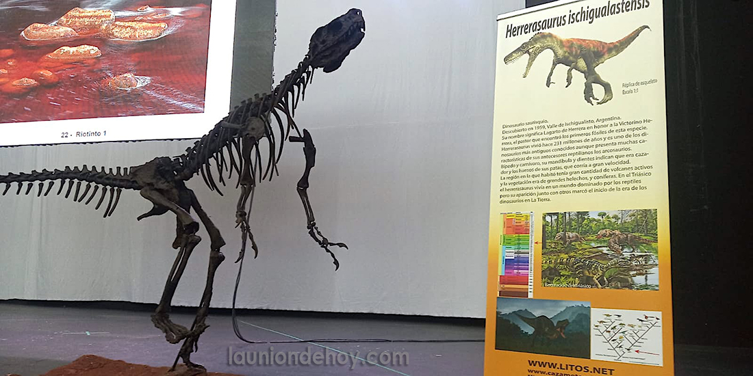 El 'Herrerasaurus ischigualastensis', uno de las réplicas exactas de esqueletos que estos días se pueden ver en la 'Feria de Minerales y fósiles de La Unión', es de los dinosaurios más antiguos de los que se tiene constancia, pues corresponde a hace 230 millones de año.