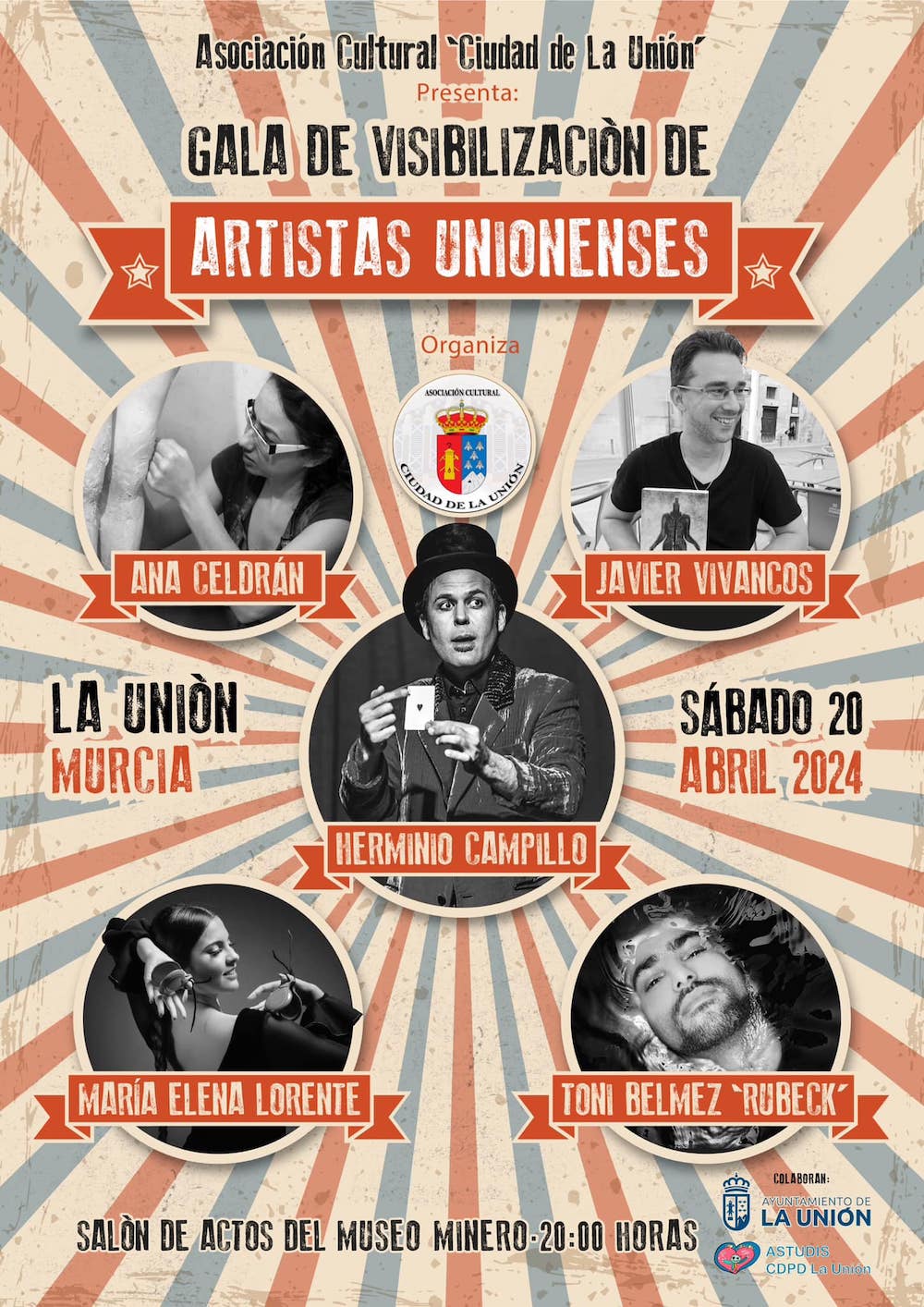 La asociación cultural 'Ciudad de La Unión' organiza un espectáculo de visibilización de artistas unionenses para el sábado 20 de abril, a partir de las ocho de la tarde, en el salón de actos del Museo Minero con actuaciones de Ana Celdrán, Javier Vivancos, Herminio Campillo, María Elena Lorente y Toni Bélmez 'Rubeck'.