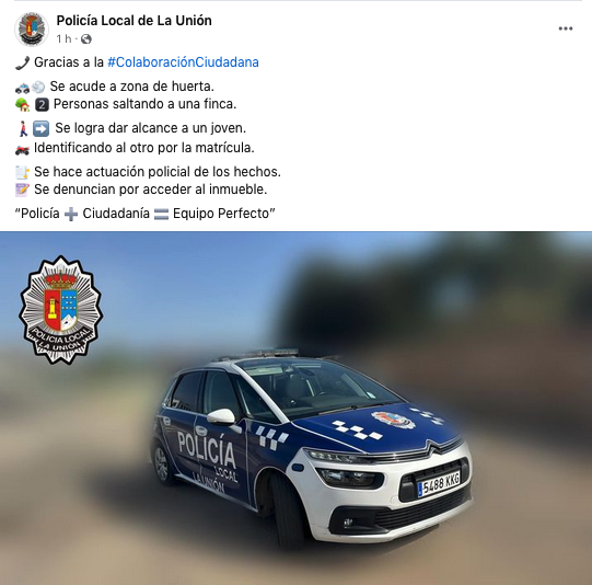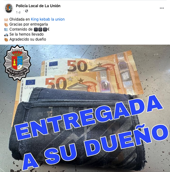 La Policía Local de La Unión acudió a una zona de huerta tras un aviso de ciudadanos de que dos jóvenes estaban saltando una finca. Los agentes alcanzaron a uno de ellos e identificaron al otro por la matrícula del coche. Por otro lado, indicar que el cuerpo municipal ha hecho llegar a su propietario un pequeño bolso son 100 euros que se dejaron olvidada en 'King Kebab' de  la ciudad. Por último, se informa que durante esta semana hay controles de velocidad.