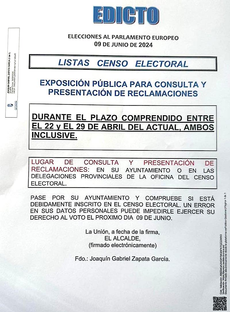 Las consultas en La Unión para las elecciones al parlamento de Europa, que tendrán lugar el 9 de junio, se pueden efectuar desde hoyo y hasta el día 29 de este mes en la sede del ayuntamiento. También está abierto el período para presentar reclamaciones si se detecta alguna anomalía.