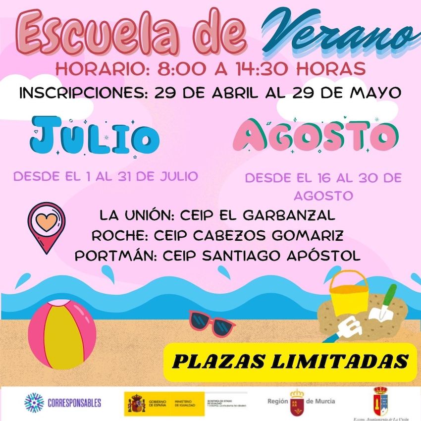 Servicios Sociales de La Unión anuncia la escuela de verano para julio (todo el mes) y agosto (del 16 al 30) para menores de 3 a 12 años de edad, que residan en el municipio y/o asisten a un centro escolar del mismo. Inscripciones abiertas del 29 de abril al 20 de mayo. Plazas limitadas.